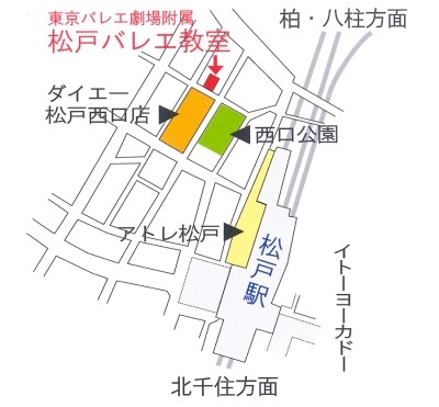 JR/新京成松戸駅から徒歩3分、西口公園<写真手前>斜め向かいのダイエー松戸店<写真左>右隣のサンアーチビル<写真中央>の2階です。